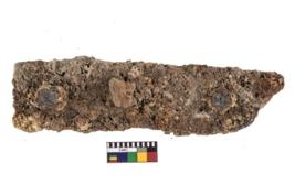 | Description / विवरण | A partially broken specimen of a iron clamp with nail it is rectangular in shape at present It is highly corroded. |