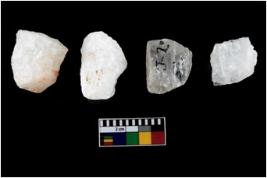 | Description / विवरण | Four utilised worked cores with sharp edges. Flakes removed from almost all the sides. Some are tapering at one end. |