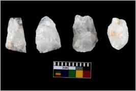 | Description / विवरण | Four utilised worked cores with sharp edges. Flakes removed from almost all the sides. Some are tapering at one end. |