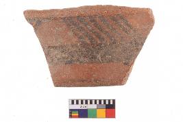 | Description / विवरण | Specimen of potsherd with decorative geometric Linear Pattern painting, Type Black on Red Ware . |