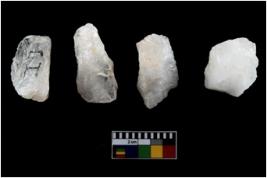 | Description / विवरण | Four utilised worked cores with sharp edges. Flakes removed from almost all the sides. Some are tapering at one end. |