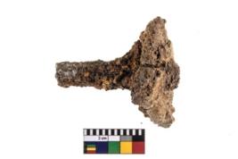 | Description / विवरण | A partially broken specimen of a iron clamp with nail it s apex portion is cuboid in shape at present It is highly corroded. |