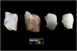 | Description / विवरण | Four utilised worked cores with sharp edges. Flakes removed from almost all the sides. Some are tapering at one end. |