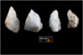 | Description / विवरण | Four utilised worked cores with sharp edges. Flakes removed from almost all the sides. Some are tapering at one end. |