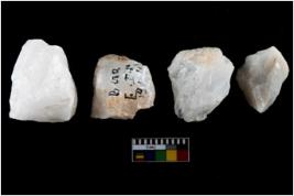 | Description / विवरण | Four utilised worked cores with sharp edges. Flakes removed from almost all the sides. Some are tapering at one end. |