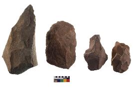 | Description / विवरण | There are n-4 of utilized flake cores. There are multidirectional irregular dominant scar pattern on both dorsal and ventral face of the cores. Some of them bulge of percussion and some are flat flake cores. |