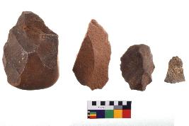 | Description / विवरण | There are n-4 of utilized flake cores. There are multidirectional irregular dominant scar pattern on both dorsal and ventral face of the cores. Some of them bulge of percussion and some are flat flake cores. |