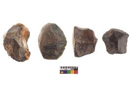 | Description / विवरण | There are n-4 of utilized flake cores. There are multidirectional irregular dominant scar pattern on both dorsal and ventral face of the cores. Some of them bulge of percussion and some are flat flake cores. |