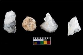 | Description / विवरण | Four utilised worked cores with sharp edges. Flakes removed from almost all the sides. Some are tapering at one end. |