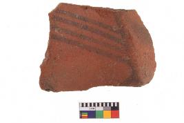 | Description / विवरण | Specimen of potsherd with decorative geometric Linear Pattern painting, Type Black on Red Ware . |