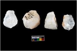| Description / विवरण | Four utilised worked cores with sharp edges. Flakes removed from almost all the sides. Some are tapering at one end. |