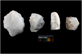 | Description / विवरण | Four utilised worked cores with sharp edges. Flakes removed from almost all the sides. Some are tapering at one end. |