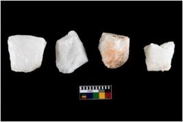 | Description / विवरण | Four utilised worked cores with sharp edges. Flakes removed from almost all the sides. Some are tapering at one end. |