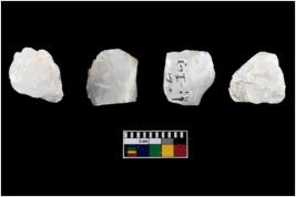| Description / विवरण | Four utilised worked cores with sharp edges. Flakes removed from almost all the sides. Some are tapering at one end. |