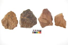 | Description / विवरण | There are n-4 of utilized flake cores. There are multidirectional irregular dominant scar pattern on both dorsal and ventral face of the cores. Some of them bulge of percussion and some are flat flake cores. |