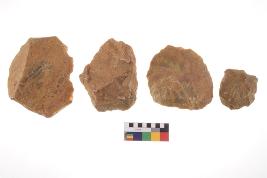 | Description / विवरण | There are n-4 of utilized flake cores. There are multidirectional irregular dominant scar pattern on both dorsal and ventral face of the cores. Some of them bulge of percussion and some are flat flake cores. |