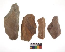 | Description / विवरण | There are n-4 of utilized flake cores. There are multidirectional irregular dominant scar pattern on both dorsal and ventral face of the cores. Some of them bulge of percussion and some are flat flake cores. |