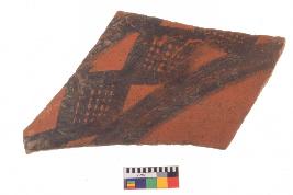 | Description / विवरण | Specimen of black on red ware with decorative geometric Diamond set broad horizontal bands painting. |
