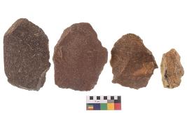 | Description / विवरण | There are n-4 of utilized flake cores. There are multidirectional irregular dominant scar pattern on both dorsal and ventral face of the cores. Some of them bulge of percussion and some are flat flake cores. |