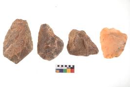 | Description / विवरण | There are n-4 of utilized flake cores. Out of them 3 are made up of Sandstone and 1 is made up of Quartzite. There are multidirectional irregular dominant scar pattern on both dorsal and ventral face of the cores. Some of them bulge of percussion and some are flat flake cores. |