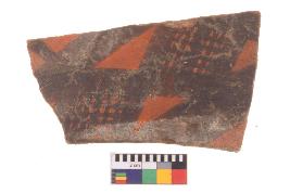 | Description / विवरण | Specimen of black on red ware with decorative geometric Diamond set Pattern painting. |