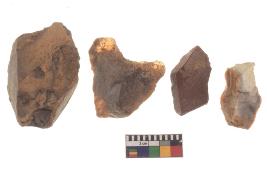 | Description / विवरण | There are n-4 of utilized flake cores. There are multidirectional irregular dominant scar pattern on both dorsal and ventral face of the cores. Some of them bulge of percussion and some are flat flake cores. |