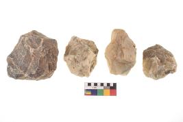 | Description / विवरण | There are n-4 of utilized flake cores. There are multidirectional irregular dominant scar pattern on both dorsal and ventral face of the cores. Some of them bulge of percussion and some are flat flake cores. |