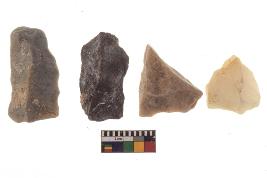 | Description / विवरण | There are n-4 of utilized flake cores. There are multidirectional irregular dominant scar pattern on both dorsal and ventral face of the cores. Some of them bulge of percussion and some are flat flake cores. |