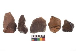 | Description / विवरण | There are n-5 of utilized flake cores. There are multidirectional irregular dominant scar pattern on both dorsal and ventral face of the cores. Some of them bulge of percussion and some are flat flake cores. |