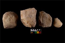 | Description / विवरण | There are n-4 of utilized flake cores. Out of them 2 are made up of Sandstone and 2 are made up of Quartzite. There are multidirectional irregular dominant scar pattern on both dorsal and ventral face of the cores. Some of them bulge of percussion and some are flat flake cores. |