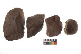| Description / विवरण | There are n-4 of utilized flake cores. There are multidirectional irregular dominant scar pattern on both dorsal and ventral face of the cores. Some of them bulge of percussion and some are flat flake cores. |