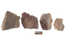 | Description / विवरण | There are n-4 of utilized flake cores. There are multidirectional irregular dominant scar pattern on both dorsal and ventral face of the cores. Some of them bulge of percussion and some are flat flake cores. |