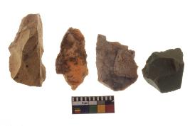 | Description / विवरण | There are n-4 of utilized flake cores. There are multidirectional irregular dominant scar pattern on both dorsal and ventral face of the cores. Some of them bulge of percussion and some are flat flake cores. |