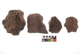 | Description / विवरण | There are n-4 of utilized flake cores. There are multidirectional irregular dominant scar pattern on both dorsal and ventral face of the cores. Some of them bulge of percussion and some are flat flake cores. |