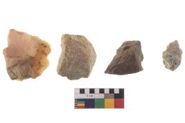 | Description / विवरण | There are n-4 of utilized flake cores. There are multidirectional irregular dominant scar pattern on both dorsal and ventral face of the cores. Some of them bulge of percussion and some are flat flake cores. |