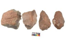 | Description / विवरण | There are n-4 of utilized flake cores. There are multidirectional irregular dominant scar pattern on both dorsal and ventral face of the cores. Some of them bulge of percussion and some are flat flake cores. |