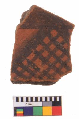 | Description / विवरण | Specimen of black on red ware with decorative geometric Net Pattern painting. |
