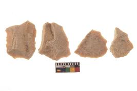 | Description / विवरण | There are n-4 of utilized flake cores. There are multidirectional irregular dominant scar pattern on both dorsal and ventral face of the cores. Some of them bulge of percussion and some are flat flake cores. |