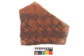 | Description / विवरण | Specimen of black on red ware with decorative geometric Diamond set broad horizontal bands painting. |