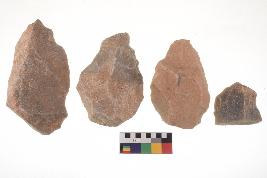 | Description / विवरण | There are n-4 of utilized flake cores. There are multidirectional irregular dominant scar pattern on both dorsal and ventral face of the cores. Some of them bulge of percussion and some are flat flake cores. |