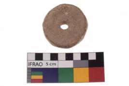 | Description / विवरण | A plain pottery disc with perforation. It is reddish in colour and has eroded edges. |