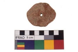 | Description / विवरण | A plain pottery disc with perforation. It is reddish in colour and has eroded edges. |