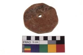 | Description / विवरण | A plain pottery disc with perforation. It is reddish in colour and has eroded edges. |