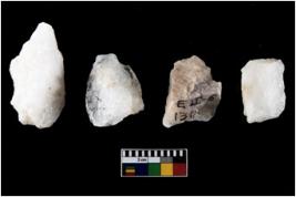 | Description / विवरण | Four utilised worked cores with sharp edges. Flakes removed from almost all the sides. Some are tapering at one end. |