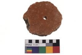 | Description / विवरण | A plain pottery disc with perforation. It is reddish in colour and has eroded edges. |