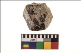 | Description / विवरण | A partially broken specimen of a gemstone garnet with smooth surface, bevelled sides with octagonal cross-section. This object contains evidence of chipping. |