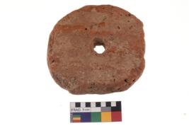 | Description / विवरण | A plain pottery disc with perforation. It is reddish in colour and has eroded edges. |