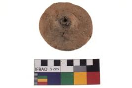| Description / विवरण | A specimen of a wheel with broken edges and scratch marks on one side near perforation, It has rough surface and reddish colour and it is well-fired and eroded. |