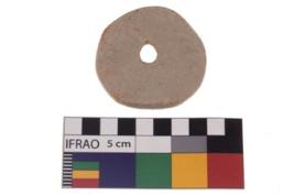 | Description / विवरण | A plain pottery disc with perforation. It is reddish in colour and has eroded edges. |