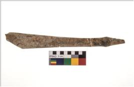 | Description / विवरण | A partially broken specimen of a bone knife, It is made out of rib bone. It has a sharp edge, The underside of the weapon probably used as a handle. Tip of weapon is broken. |